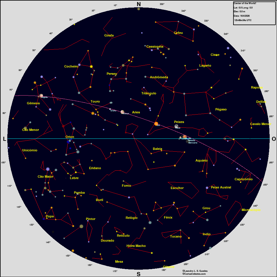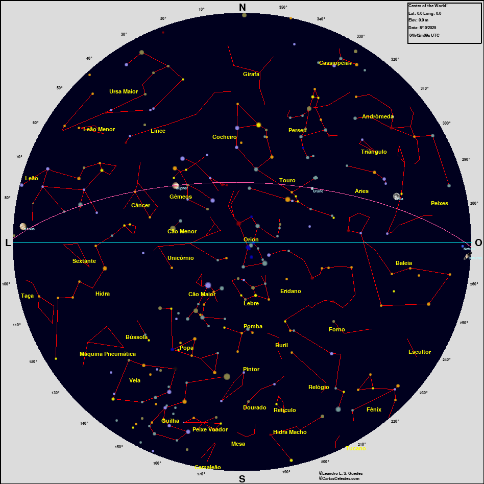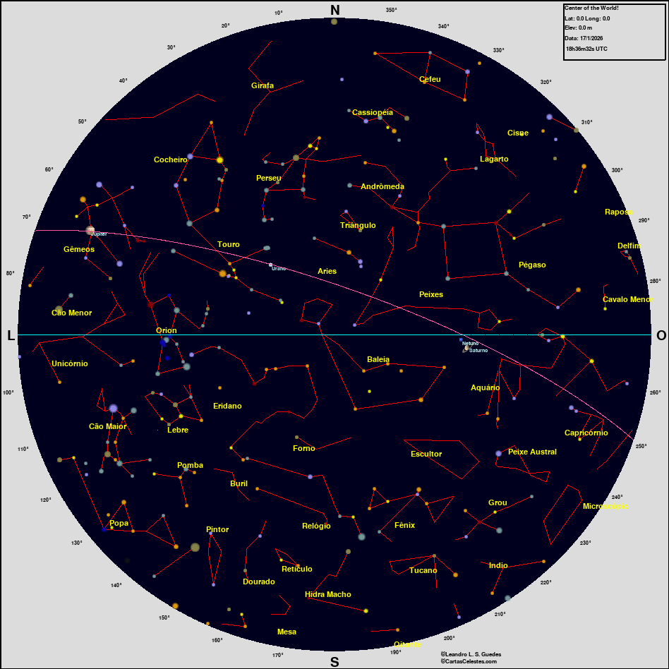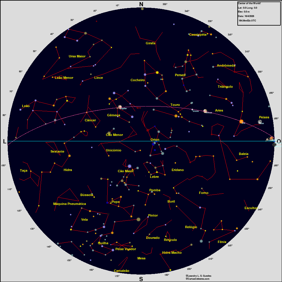 Imprima e erga a Carta Celeste sobre sua cabeça coincidindo os pontos cardeais do seu local com os que você vê indicados na Carta. O céu do local que você escolheu, na hora que você escolheu, estará representado na Carta com os astros em suas respectivas posições;